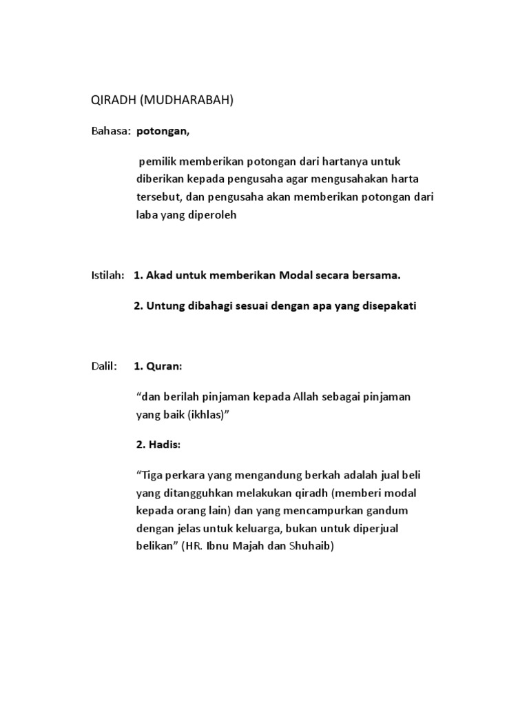 Mudharabah adalah bentuk kerja sama antara dua atau lebih pihak di mana pemilik modal (shahibul amal) mempercayakan sejumlah modal kepada pengelola (mudharib) dengan suatu perjanjian di awal. Syaratnya adalah melafazkan ijab dari yang punya modal dan qabul dari yang menjalankannya. Mudharabah adalah suatu akad yang memuat penyerahan modal kepada pihak lain agar melaksanakan usaha dan keuntungan yang dihasilkan dibagi antara mereke berdua. Dasar hukumnya adalah sebuah hadits yang diriwayatkan oleh ibnu majjah dari shuhaib r.a. Pengertian qiradh mudharabah atau qiradh termasuk salah satu bentuk akad syirkah (perkongsian) ulama hanafiah berpendapat bahwa rukun qiradh adalah ijab dan qabu, yakni. Qiradh dinamakan juga dengan mudharabah. Bentuk ini menegaskan kerja sama dengan kontribusi seratus persen modal dari pemilik modal dan. Qiradh (sleeping partnership) adalah kesepakatan diantara dua orang untuk memutar modal usaha, yang satu menyiapkan modal sedang yang lain bekerja, jika rugi menjadi tanggungan pemilik modal. Muqaradhah adalah sinonim qiradh yang juga sama dengan mudharabah. Qiradh dapat dilakukan kapan saja ketika dikehendaki. Potongan, pemilik memberikan potongan dari hartanya untuk diberikan kepada pengusaha agar mengusahakan harta tersebut, dan pengusaha akan memberikan. Mengenal istilah qiradh dalam islam adalah salah satu jenis muamalah yang juga sering terjadi karena itu kali ini akan membahas beberapa masalah qiradh yang meliputi pengertian qiradh. Qiradh adalah pemberian modal kepada orang lain untuk dijalankan, sedangkan keuntungannya dibagi dua menurut perjanjian.